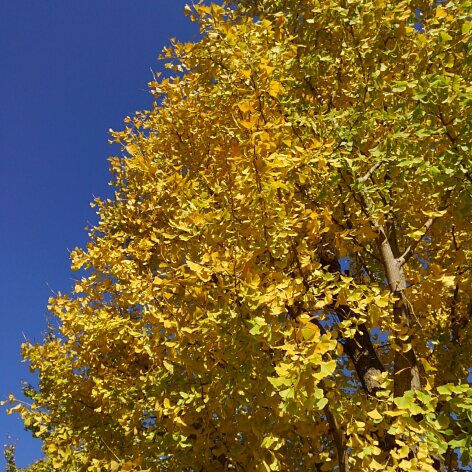子どもが銀杏の葉っぱをあたまからかぶって遊んでて、