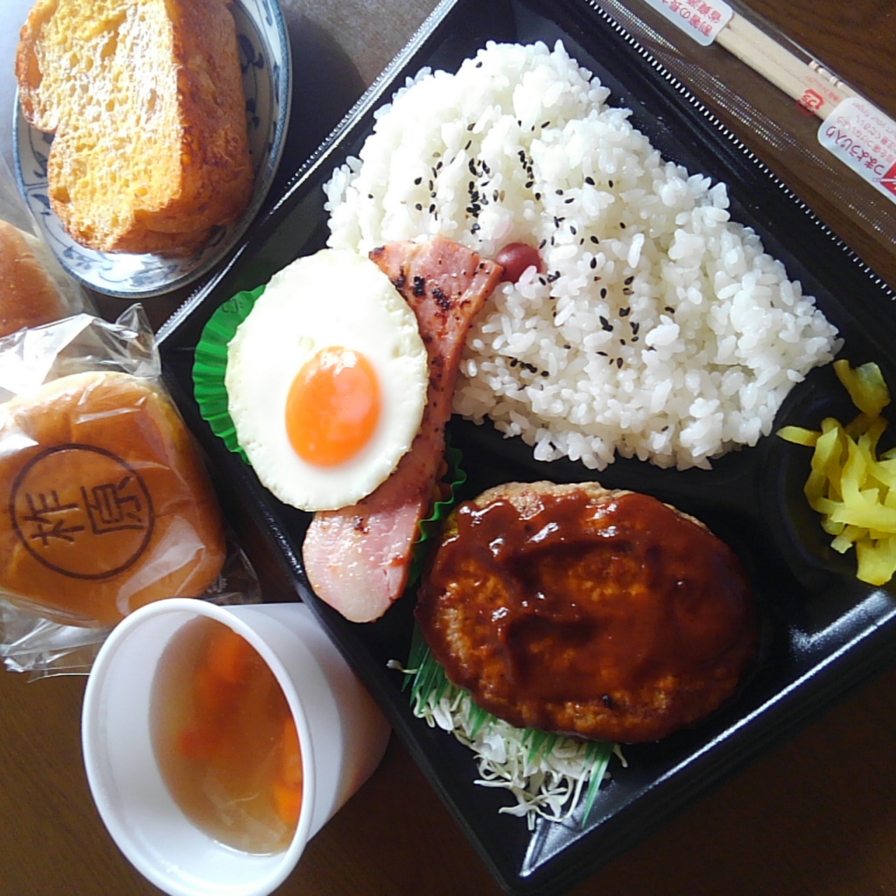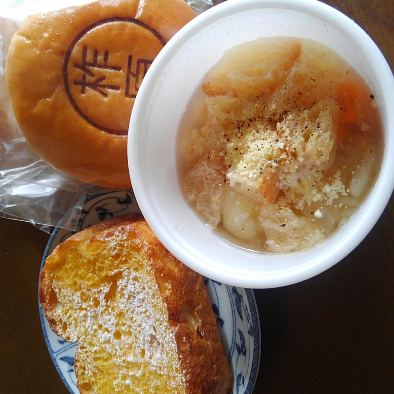 セルフサービスのコンソメスープ(60円!)なんて自分の加減しだいだし、レジ前に売ってた小袋いっぱいなクルトン(50円!) を入れればボリュームアップだし!